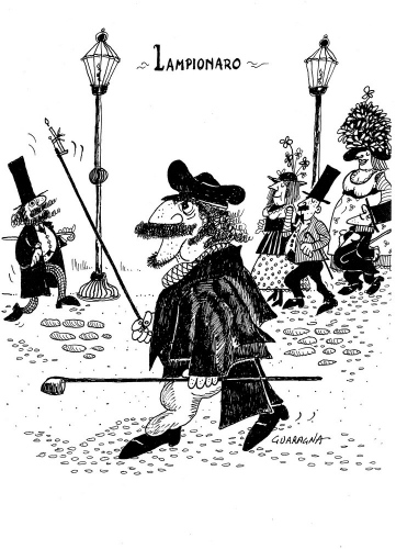 Addetto all’accensione e alla manutenzione dei lampioni a gas o a petrolio, disseminati lungo le facciate dei palazzi di Roma. Fino all’avvento dell’energia elettrica, egli accendeva i lampioni all’ora dell’Ave Maria, ora che rappresentava per i Romani motivo di riflessione e coincideva con il tramonto del sole. All’alba un suo collega li spengeva. Cosi, di notte, la città rimaneva illuminata, specie nei crocevia, per evitare ai viandanti sgradite sorprese. Il Lampionaro rifaceva tutte le sere il medesimo percorso, munito di una canna di oltre due metri, sulla quale brillava una fiammella. Portava anche con sé una scala e una borsa per gli attrezzi, per intervenire su quei lampioni mal funzionanti o su quelli protetti, che avevano bisogno di essere aperti per essere accesi. Egli indossava un berretto a visiera blu e una divisa con pantaloni e zinale dello stesso colore. Era un salariato del Municipio. Oggi i Lampionai non esistono più e purtroppo, non esistono più a Roma neanche i meravigliosi lampioni a muro.