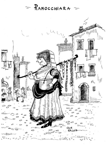 Ella catturava le prede lungo il corso dei torrenti, nei fossi o nei pantani, dove l’acqua era più limpida e dove i saltellanti anfibi commestibili erano più numerosi, li tramortiva battendo le loro teste su di un sasso e li riponeva in un paniere di vimini, detto nel gergo dei pescatori “Cerignolo”. Terminata la caccia, quando i ranocchi raccolti erano sufficienti per guadagnarsi una decente giornata, li spellava, li sbuzzava, li sciacquava pazientemente e ne formava mazzette da dodici esemplari da vendere la mattina del giorno successivo per le strade di Roma. I romani non è che fossero molto propensi a mangiare rane, ma il piatto era molto economico e la fame era tanta, benché con le rane non ci sia molto da sfamarsi. Tuttavia la “Ranocchiara” setacciava strada per strada i rioni della città al grido: “ranocchie io porto belle e delicate, ché dal pantano adesso l’ho cavate!”. Ancora, di tanto in tanto qualche “Ranocchiara” ambulante si affaccia nelle nostre città, ma ormai sono diventate rare come le mosche bianche.